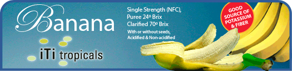 Fully matured fruit is transported to processing plant and ripened at controlled ripening chambers. The fruits are inspected, washed, screened, and peeled out, crushed, deseeded, and de-aerated. Product is commercially sterile and filled in an aseptic bag following the guidelines under good manufacturing practices. From our warehouses today, iTi can offer acidified banana puree, non acidified banana puree, banana puree with and without seeds, organic banana puree and 70 brix clarified banana concentrate. The banana puree is packed in either 6 gallon bag-in-box- 55 gallon bag in drum or 220 gallon. Popular formulations with tropical fruits are acai- banana, passion fruit- banana, moraberry- banana etc